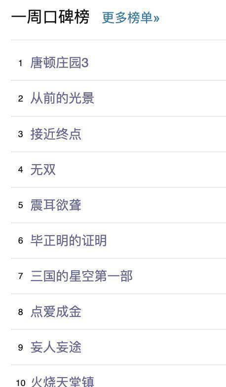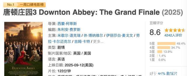 大概呢,本周院线片基本就是这个样子。 同时,一周豆瓣口碑榜也是可以了解下的。我们一起来看,这一周,又有哪些新的影片上榜吧。 一周口碑榜 1 《唐顿庄园3》