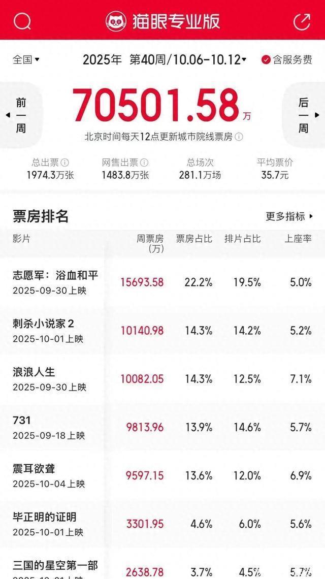 其实光看票房情况,上周的票房还挺好的。 上周内地院线票房是7亿,且有三部影片的票房过亿。